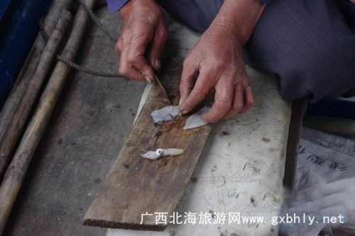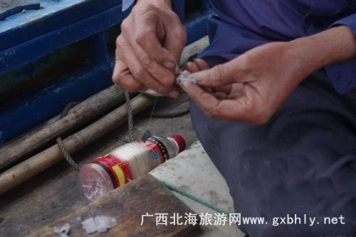 在等著魚兒撞網(wǎng)的一個小時里,我們在大叔的指導(dǎo)下開始了釣魚。先是用小刀將提前準(zhǔn)備好的魷魚,切成小塊當(dāng)誘餌,我們的釣魚工具很特殊,一個罐瓶子卷著釣線,漁夫告訴我們,在深海釣魚用這種辦法比較好釣,又很有手感,當(dāng)?shù)氐臐O民出海釣魚都是這樣釣的。就這樣,我們的帥哥美女們就開始認(rèn)真的釣了起來,因為比較生疏,就漁夫釣了幾條石頭魚。