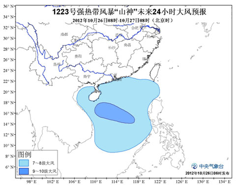 受“山神”和冷空氣的共同影響,26日08時至27日08時,我國黃巖島附近海域、三沙市及其附近海域以及南海中部海域?qū)⒂?-9級大風(fēng),陣風(fēng)可達10-11級,“山神”中心經(jīng)過的附近海域的風(fēng)力有10-11級,陣風(fēng)可達12-13級;巴士海峽、巴林塘海峽、南海北部和南部海域、瓊州海峽、北部灣以及廣東沿海、海南沿海也將有6-7級大風(fēng),部分海域或地區(qū)陣風(fēng)可達8-9級;黃巖島及三沙市附近海域、海南島東部將有大到暴雨。