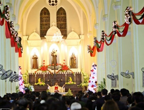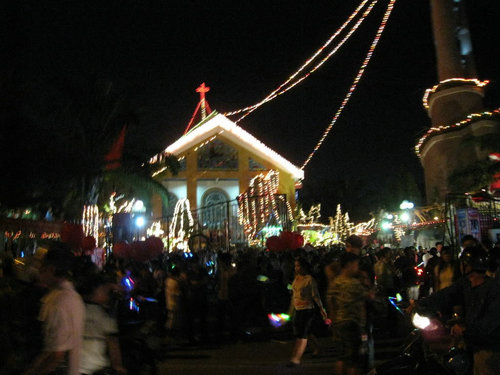 圣誕節(jié)期間,白天,小販們會叫賣著各式各樣的圣誕用品。街道上,也有成群結(jié)隊(duì)的、長著金發(fā)碧眼的老外走過。一到夜晚,大教堂便高懸華燈,吸引所有人的目光。人們在主教的帶領(lǐng)下用越南語吟唱著圣經(jīng),氣氛肅穆而溫暖。