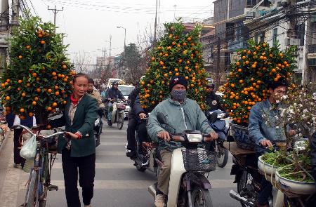 在越南首都河內(nèi)街頭,幾名居民拉著從花市買回的柑桔樹回家。與中國(guó)一樣,春節(jié)是越南最隆重的傳統(tǒng)節(jié)日,家家戶戶都會(huì)在節(jié)前準(zhǔn)備各種年貨。