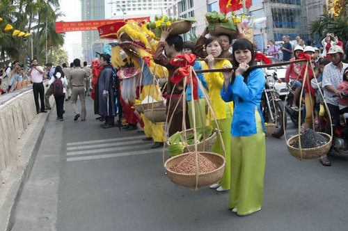 花市是越南春節(jié)重要活動(dòng)之一。比如河內(nèi),春節(jié)前約10天,花市就開始熱鬧。越南人最愛的年花有劍蘭、大麗菊、金桔和桃花。除了鮮花、盆景,花市還出售各式氣球、彩燈、玩具、年畫、春聯(lián)、年歷等,把相連的幾條街道裝點(diǎn)得五彩繽紛,喜氣洋洋。
