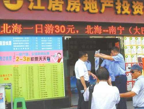近日,為徹底清理和打擊以“一日游”為旗號的涉嫌傳銷違法行為,凈化旅游環(huán)境,維護城市形象,北海市旅游、工商、公安、交通運輸、住房和城鄉(xiāng)建設(shè)等局專門發(fā)出了清理打擊以“一日游”為旗號涉嫌傳銷違法行為的通告,并根據(jù)市民提供的線索,開展聯(lián)合執(zhí)法。執(zhí)法人員分別對“寄生”于北海大道九福東盟自貿(mào)城西邊的火車售票處、重慶東路蒙之海投資有限公司和北海大道九福東盟自貿(mào)城西邊江居房地產(chǎn)投資公司三個屢教不改的黑窩點進行了查處,當(dāng)場清除了6塊非法廣告招牌,沒收“一日游”非法宣傳資料10萬多份,工商部門還對涉案經(jīng)營單位存在的超范圍經(jīng)營、非法經(jīng)營“一日游”和頂風(fēng)作案等行為進行立案查處。(北海日報9月4日訊)