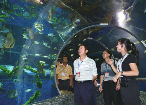 擁有神秘大海、遠(yuǎn)古海洋、時(shí)光隧道、珊瑚海、夢(mèng)幻海洋、貝類文化、南珠文化、海洋劇場(chǎng)等16大主題的北海海洋之窗,讓嘉賓們近距離地看到種類繁多的活生生的海洋生物。各色熱帶魚(yú)類、美麗的活體珊瑚、憨態(tài)可掬的大海龜,以及館內(nèi)的巨型深海圓缸令嘉賓們流連忘返。(北海晚報(bào)訊)