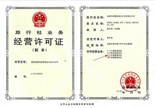 解讀:邊境旅游業(yè)務(wù)屬特殊旅游業(yè)務(wù),需另行申請。如“北海至越南下龍海上5日游邊境旅游業(yè)務(wù)”就需在出境旅游業(yè)務(wù)的基礎(chǔ)上另行申請。申請成功后,增存質(zhì)量保證金10萬元人民幣,然后“到國家旅游局換發(fā)《國際旅行社業(yè)務(wù)經(jīng)營許可證》、到工商行政管理部門辦理經(jīng)營范圍變更登記手續(xù)、到公安部門和相關(guān)口岸邊防檢查站辦理備安手續(xù)”。辦理完成后,經(jīng)營范圍中便會增加“邊境旅游業(yè)務(wù)”項目。