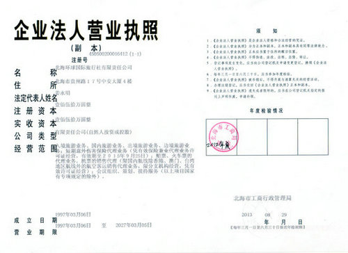 北海環(huán)球國際旅行社有限責(zé)任公司是經(jīng)國家旅游局批準(zhǔn)成立的具有出境游資格的一類國際旅行社,已足額交納旅游質(zhì)量保證金170萬元,主營:入境旅游業(yè)務(wù)、出境旅游業(yè)務(wù)、邊境旅游業(yè)務(wù)、國內(nèi)旅游業(yè)務(wù)四大旅游業(yè)務(wù),是北海目前規(guī)模最大、綜合實力最強的國際旅行社之一(國際旅行社經(jīng)營許可證號:L-GX-CJ00037)。