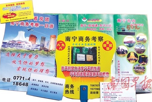 李先生稱,一日游的第一站是廣西體育中心,接著是廣西規(guī)劃館、會(huì)展中心、南寧經(jīng)濟(jì)技術(shù)開發(fā)區(qū)等9個(gè)“景點(diǎn)”。“導(dǎo)游會(huì)對(duì)這些景點(diǎn)做一些介紹,但說來說去其實(shí)就是圍繞南寧的經(jīng)濟(jì)發(fā)展在說,說南寧有北部灣的開放開發(fā)政策,區(qū)位優(yōu)勢(shì)明顯,投資前景廣闊,來自五湖四海的朋友要懂得抓住機(jī)遇”。