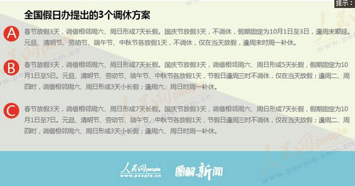 【點評】 第三種方案,形成了春節(jié)、國慶兩個7天長假。不管是從經(jīng)濟發(fā)展還是旅游帶動來說都是比較好的方式。預計大多數(shù)老百姓也會選這一項。