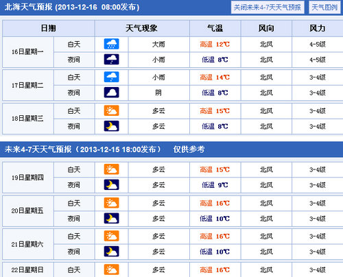 據北海氣象局最新天氣預報,受較強冷空氣影響,北部灣海面:今天,陰天有大雨,偏北風逐漸加大到7到8級,陣風9級;17日,有小雨,偏北風6級。北海港和潿洲島各臺風警報站所掛的強風信號一號風球不改變。