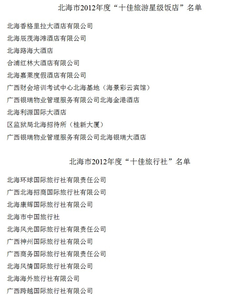 近日,北海旅游局發(fā)布通知,根據《關于開展北海市2012年度“十佳旅游星級飯店”和“十佳旅行社”評選活動的通知》(北旅發(fā)[2013]95號)精神,經對申報的旅游星級飯店和旅行社進行標準評定,入圍“十佳旅游星級飯店”和“十佳旅行社”的企業(yè)名單已產生,依照評定程序,現予以公示,公示期5天(從2013年12月19日至12月23日)。如對入圍企業(yè)有不同意見需反映,請在公示期內書面反饋至我局質管科(電話3032316,傳真3031960),逾期不再受理。
