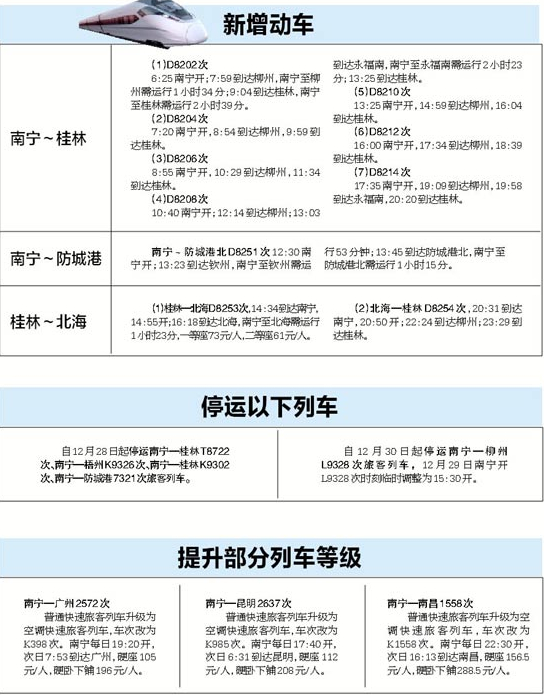 當(dāng)代生活報(bào)訊 昨日,記者從南寧火車站獲悉,火車站從12月28日零時(shí)起調(diào)整列車運(yùn)行圖,新增開(kāi)了動(dòng)車,并停運(yùn)部分列車和增加或取消部分車站,還有部分普通快速旅客列車升級(jí)為空調(diào)快速旅客列車。