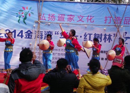 據報道,為弘揚疍家文化打造品質景區(qū),元旦當天,北海市在金海灣紅樹林生態(tài)旅游區(qū)舉辦“2014金海灣‘華一·紅樹林’疍家民俗文化節(jié)”,富有本地民俗特色的疍家婚禮、疍家民謠、咸水歌、英姿颯爽的地角女民兵出現在市民和游客面前,深受大家的追捧。
