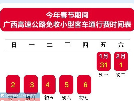 今年春節(jié)放假時(shí)間為1月31日至2月6日,即大年初一至初七,如果按照交通部的文件精神執(zhí)行,廣西高速公路今年春節(jié)期間免費(fèi)通行的時(shí)間是1月31日00:00時(shí)起,至2月6日24:00時(shí)結(jié)束,也就是年初一至初七可免費(fèi)通行,除夕當(dāng)天廣西高速公路不免費(fèi)通行。