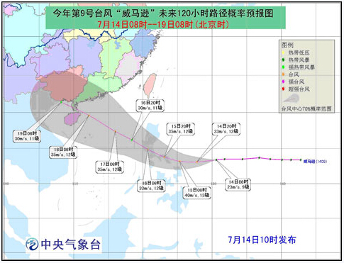 預(yù)計(jì),“威馬遜”將以每小時(shí)25公里左右的速度繼續(xù)向偏西方向移動,強(qiáng)度逐漸加強(qiáng),最強(qiáng)可達(dá)臺風(fēng)級(12-13級,35-40米/秒)。“威馬遜”有可能于16日凌晨登陸菲律賓呂宋島東部沿海,16日下午至夜間進(jìn)入南海東部海面。14-15日,“威馬遜”對我國海域無影響。