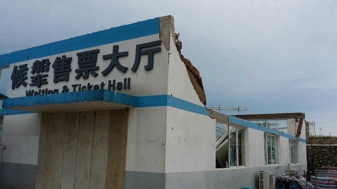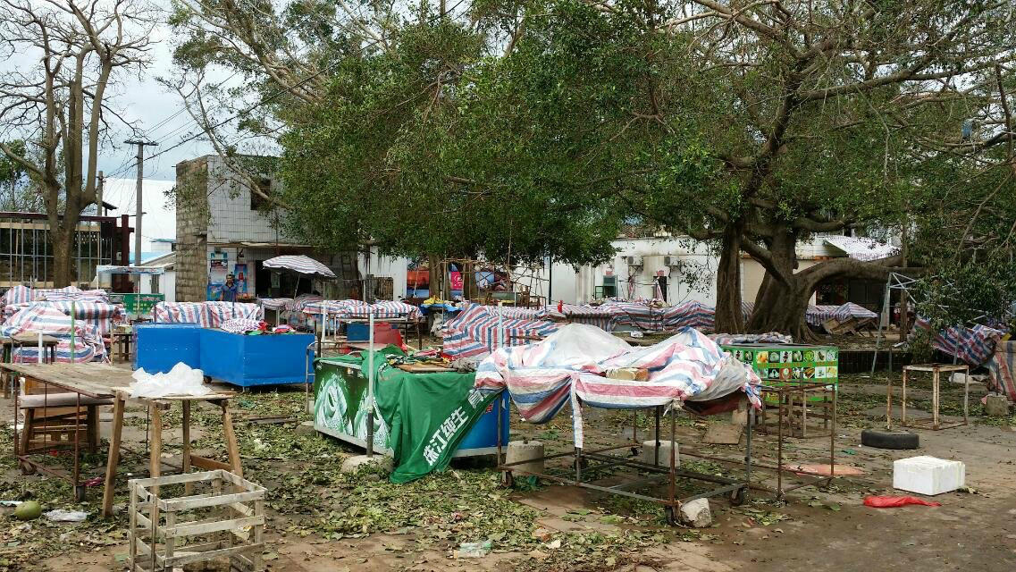 臺(tái)風(fēng)過(guò)境后,慘象隨處可見(jiàn)。從潿洲島西角碼頭上行,船票售票大廳半邊屋頂被掀走,停車(chē)場(chǎng)附近的工作棚已垮塌。從碼頭由北向南行進(jìn)村道兩旁,不時(shí)看到碩大的榕樹(shù)被連根拔起,一些客棧損毀嚴(yán)重;在島上著名的石螺口、滴水丹屏景區(qū),大排檔、游客服務(wù)區(qū)的大棚設(shè)施被刮得只剩鋼柱矗立;在南灣鎮(zhèn)中心,農(nóng)貿(mào)市場(chǎng)和海鮮市場(chǎng)已經(jīng)被完全摧毀;島上水電線(xiàn)路持續(xù)癱瘓,直至7月22日南灣鎮(zhèn)中心才實(shí)現(xiàn)供水供電。
