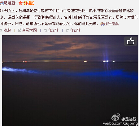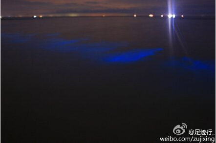 巧的是,據(jù)潿洲島上的網(wǎng)友反映昨天晚上,潿洲島牛欄山村海邊再度出現(xiàn)熒光海灘。