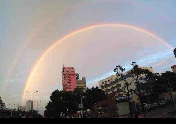 昨天(21日)傍晚,強(qiáng)降雨過程剛剛減弱的空隙,北海市區(qū)天空美景如畫,晚霞和雙彩虹相應(yīng)成趣的在天空舞臺上精彩的“表演”,讓很多路人駐足觀看。諺語有“朝霞不出門,晚霞行千里;東虹日頭,西虹雨”的講法,昨天傍晚北海市出現(xiàn)的是“西邊晚霞,東邊彩虹”景象,當(dāng)時拍攝地點廣東路還下著點小雨。此次彩虹生命極短,從單虹變雙虹直至消失只持續(xù)了30分鐘左右。