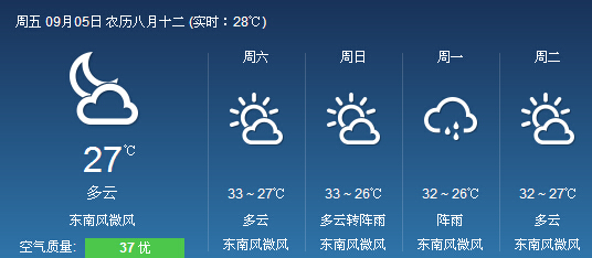 北海市:未來(lái)兩天內(nèi),多云間陰天,東南風(fēng)2到3級(jí),最低氣溫27度,最高氣溫33度。北部灣海面:未來(lái)兩天內(nèi),多云間陰天,東南風(fēng)4到5級(jí),輕到中浪,能見(jiàn)度15到30公里。