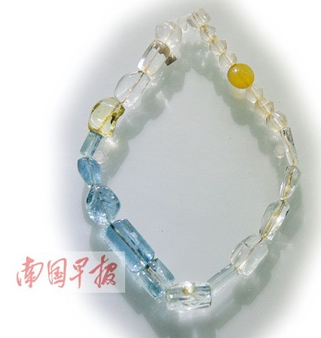 “三色水晶串珠”于1990年在合浦黃泥崗漢墓出土,串珠上有4顆漂亮的淺藍(lán)色晶體,琢成圓柱形,最小的一顆也有花生米大!爱(dāng)時(shí)的文物與考古學(xué)家都認(rèn)為這種淺藍(lán)色相當(dāng)少見(jiàn)”,合浦漢代文化博物館館長(zhǎng)廉世明說(shuō),這幾粒晶體最后被鑒定為“罕見(jiàn)的淺藍(lán)色水晶”。
