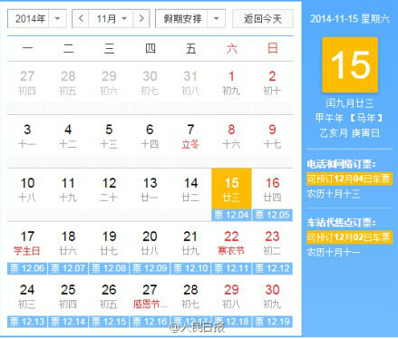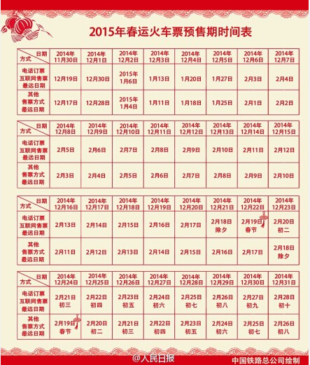 據(jù)中國(guó)之聲《全國(guó)新聞聯(lián)播》報(bào)道,中國(guó)鐵路總公司今天發(fā)布:從12月1號(hào)起,鐵路互聯(lián)網(wǎng)售票、電話訂票的預(yù)售期將由目前的20天逐步延長(zhǎng)至60天。12月7號(hào)起,將開始發(fā)售2015年鐵路春運(yùn)火車票。車站窗口等其他售票方式仍按錯(cuò)后兩天的原則執(zhí)行。