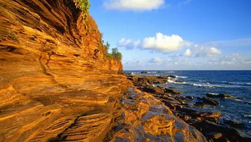 海未枯,石已碎。在芝麻灘,我見到了顏色和大小像極黑芝麻的火山碎粒。它們布滿山崖,和其他砂粒擠在一起,上面還趴著很多綠色小蝸牛,整個就像一塊長長的芝麻綠豆糕!案恻c”上層是綠色植被,有些地方,幾條長長的翠生生的藤蔓婆娑下墜! ∶娉蠛#瑠A在藤蔓之間,背景是千年古崖,在海濤聲中,“咔嚓”一聲,留個倩影,定格在永恒時間的某一瞬,別提是一件多美的事了!海水退潮之后,還可以在層層疊疊的火山熔巖上漫步、玩耍、留影! ∵@些熔巖身上含有多種金屬元素,再加上低洼處的積水和海浪沖擊飛濺的浪花,在陽光照耀下,五光十色,美不勝收。因此,芝麻灘也叫五彩灘。
