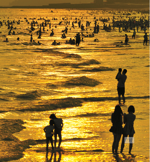 7月8日傍晚,記者來到北海銀灘看到,如織的人流在不斷走向銀灘浴場戲水納涼。不一會金色夕陽播撒在銀灘浴場淺灘上,人們紛紛拿出手機、相機拍攝記錄這精彩一刻。