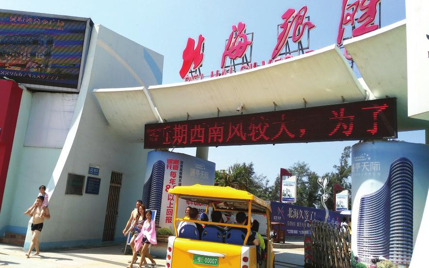 電子LED顯示屏及時滾動播放當天天氣及海浪情況,提醒游客注意游泳安全。