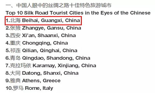 6月19日,“2017絲綢之路旅游推介之夜”在甘肅永靖隆重舉行,揭曉了“2017年度中國人眼中的絲綢之路旅游十佳”8組榜單,著名濱海旅游城市——北海,成功入選中國人眼中的絲綢之路十佳特色旅游城市,成為廣西唯一入選的特色旅游城市。