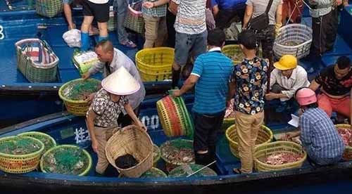 一大早,外沙橋頭,就看到有不少“排仔船”已經(jīng)在出售從出海漁船上裝回的海鮮,進(jìn)貨的商販們也早早地守候在此。