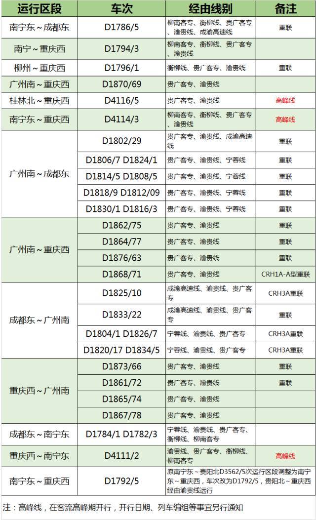 新增南寧東~西安北動(dòng)車(chē)組1對(duì),車(chē)次D1710/1/0 D1709/12/09次,經(jīng)由柳南客專(zhuān)、衡柳線、貴廣客專(zhuān)、渝貴線、蘭渝線、西成客專(zhuān)運(yùn)行。