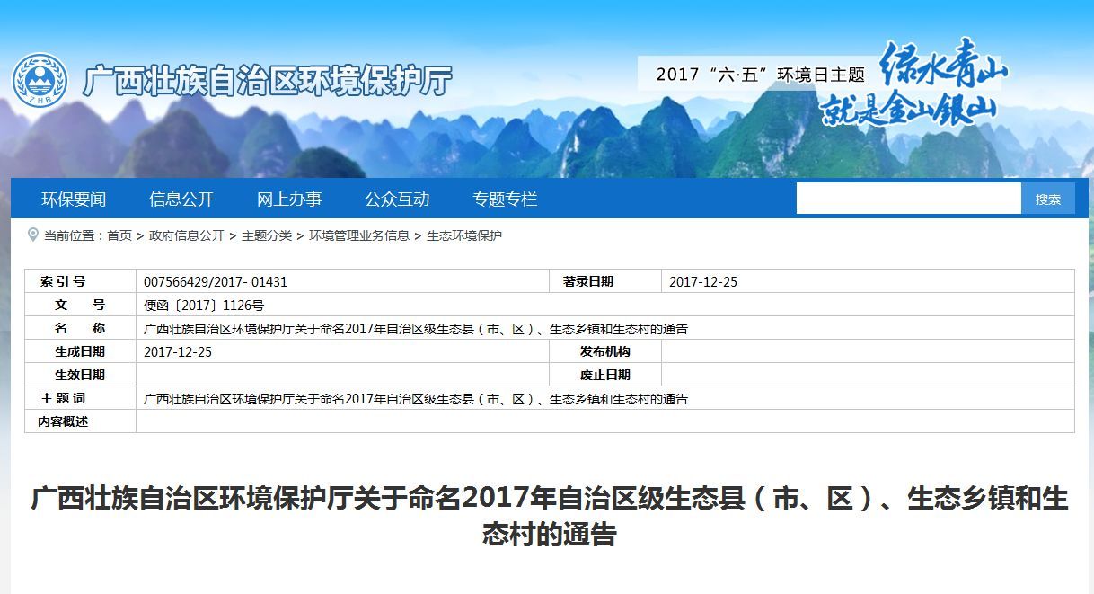 按照《生態(tài)廣西建設(shè)規(guī)劃綱要》(桂政發(fā)〔2007〕34 號)要求,全區(qū)各級政府積極創(chuàng)建生態(tài)建設(shè)示范縣(市、區(qū))、示范鄉(xiāng)鎮(zhèn)和示范村。經(jīng)嚴(yán)格組織考核驗收,決定授予桂林市陽朔縣等9 個縣(市、區(qū))“自治區(qū)級生態(tài)縣(市、區(qū))”稱號,授予南寧市馬山縣百龍灘鎮(zhèn)等147 個鄉(xiāng)鎮(zhèn)“自治區(qū)級生態(tài)鄉(xiāng)鎮(zhèn)”稱號,授予南寧市武鳴區(qū)城廂鎮(zhèn)大梁村等756 個行政村“自治區(qū)級生態(tài)村”稱號。
