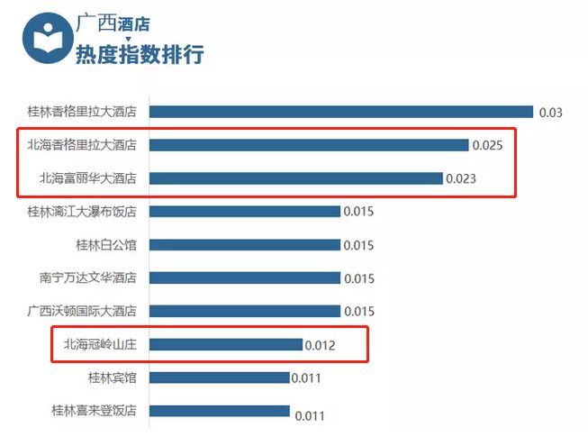 得益于城市、旅游景區(qū)熱度指數(shù)的持續(xù)飆升,北海酒店住宿業(yè)也有所提升。在12月份的數(shù)據(jù)報(bào)告中,北海香格里拉大酒店、北海富麗華大酒店占據(jù)榜單二、三名,僅次于一家桂林酒店。