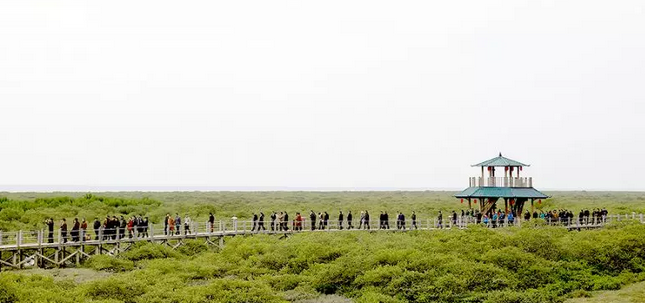 3000多畝紅樹林層層疊疊,郁郁蒼蒼,成群的白鷺于其中或翩然起舞,或怡然休憩。紅樹林下,招潮蟹、彈涂魚、小鱟、貝類等海洋生物隨處可見。招潮蟹身上鮮艷的紅色,彈涂魚有趣的跳躍行走方式、張大嘴巴引吭高歌的模樣,引來了一撥又一撥新奇的目光。