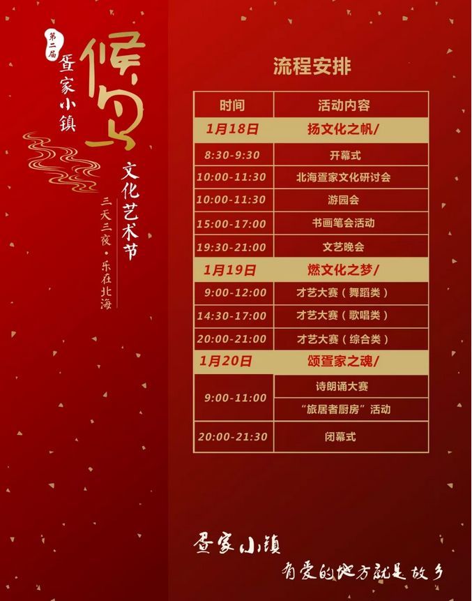 疍家小鎮(zhèn)“三天三夜·樂在北海”第二屆“候鳥”文化藝術(shù)節(jié)秉承“交流、交融、交集”作為活動(dòng)主線,確立“揚(yáng)文化之帆”、“燃文藝之夢(mèng)”、“頌疍家之魂”為三個(gè)活動(dòng)日的主題。