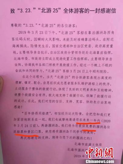 這份《感謝信》稱,“‘百年修得同船渡’,相信經(jīng)歷這次險情,會把您和我們更加緊密地聯(lián)系在一起,我們將誠摯地邀請您在未來一年內(nèi)(2020年3月24日前),再游潿洲島。我們將為您提供免費(fèi)的潿洲島往返船票和景區(qū)門票……。