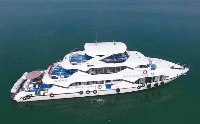 北海環(huán)島游,游覽時間2小時左右---安全、平穩(wěn)、舒適的雙體豪華客輪,同時容納200人、配備觀光平臺,高級靠背椅、空調、高級音響設備等、北海環(huán)島游船途經: 1. 古代海上絲綢之路出? 2.本土文化濃郁的地角漁村 3.海上"蒙古包"--海洋牧蠔場 4.外沙海鮮島 5.北海軍港、海警、海關碼頭 6.紅帆海濱 7.北海深水港 8. 海角孤峰--冠頭嶺(北嶺) 9.海上牧區(qū)--沙占魚釣魚場 10.海上人家 11.冠頭嶺一帶常有國家一級保護動物白海豚出沒!厦赓M提供:海上垂釣,東南亞風情舞蹈表演秀、民族舞、TOP舞、趣味游戲