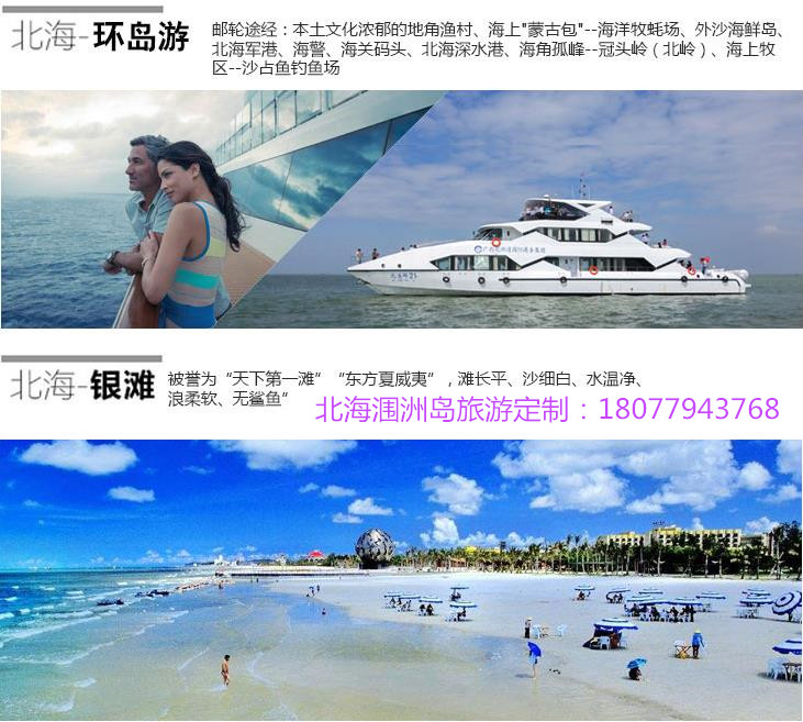 1、北海環(huán)島游:乘豪華游輪出海、游船途經(jīng):本土文化濃郁的地角漁村、.海上"蒙古包"--海洋牧蠔場(chǎng)、外沙海鮮島、北海軍港、海警、海關(guān)碼頭、北海深水港、海角孤峰--冠頭嶺(北嶺)、海上牧區(qū)--沙占魚(yú)釣魚(yú)場(chǎng)——船上免費(fèi)提供:東南亞風(fēng)情舞蹈表演秀、民族舞、TOP舞、趣味游戲。
