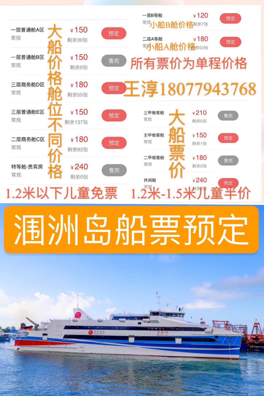 關(guān)于潿洲島船票預(yù)定,怎么定,首先確定了來北海的時(shí)間,人數(shù),聯(lián)系我們的客服18077943768加微信最方便,因?yàn)榇笔菍?shí)名制的,我們需要有了你的名單后,方可預(yù)定,然后還要付款到我們客服微信或支付寶,船票為實(shí)名制定票,也就是定了你的名字,只能你去坐船,否則船票就用不了啦,所以完全不用擔(dān)心任何問題,定船票,名字身份證號碼還有錢,一樣也不能少,我們預(yù)定船票,都是實(shí)際票款收取,不另外收任何手續(xù)費(fèi)用,這個(gè)請放心,當(dāng)然,其實(shí)你要真的去潿洲玩,跟我們團(tuán)隊(duì),小包團(tuán)玩是方便的,自由,無憂,所有的我們都可以定好,這樣省心省力省時(shí)