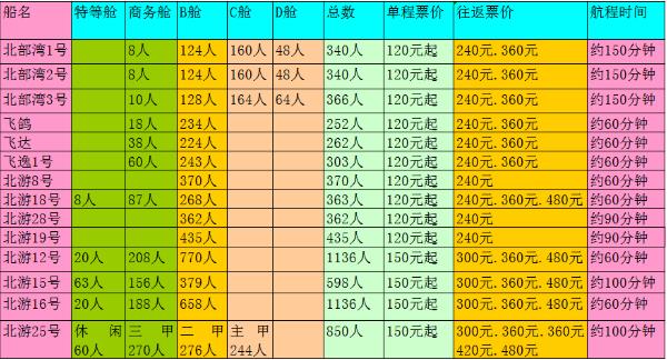 飛達(dá),飛逸1號(hào),北游18:A等艙(位于二樓)180元/人,B等艙(位于一樓)120/人,特等艙240元/人
