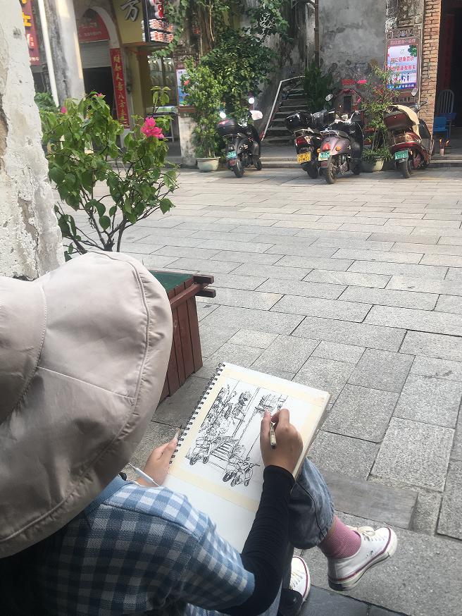 但最近兩天看到有不少年輕學(xué)生哥、學(xué)生妹都來(lái)老街寫(xiě)生,感覺(jué)這老街年輕熱鬧的氣氛又回來(lái)了。以前暑假的時(shí)候,老街上會(huì)有很多全國(guó)各地藝術(shù)院校過(guò)來(lái)采風(fēng)的藝術(shù)生,她們把老城的騎樓建筑和景致“搬”上畫(huà)紙,游客也把她們認(rèn)真作畫(huà)的身影留在朋友圈。