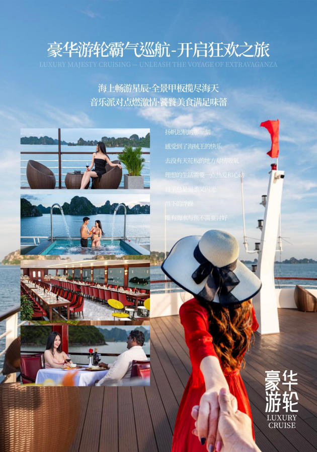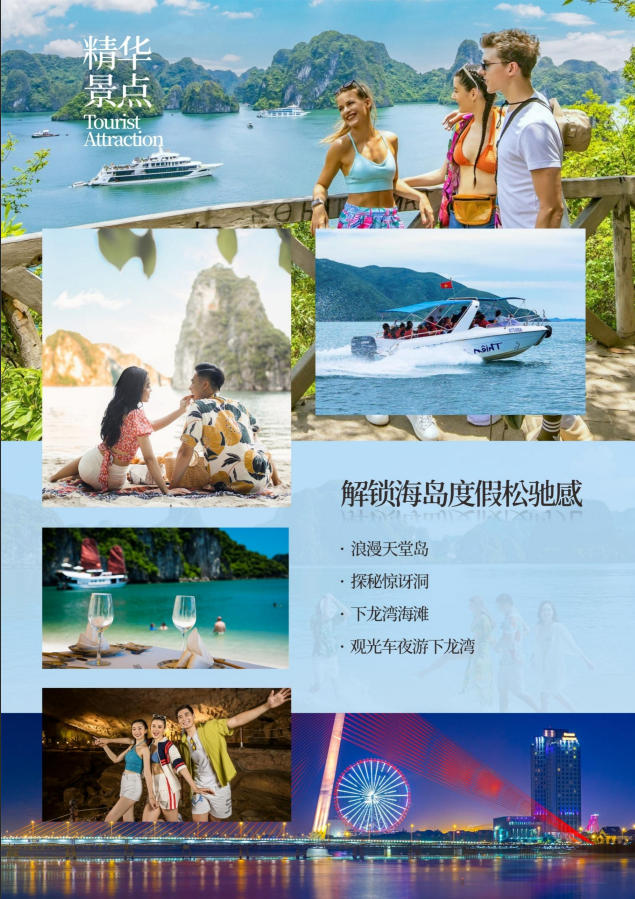 早餐后乘坐【diamond cruises號或dream cruises 或phoenix vip cruise或同級別】,暢游海上桂林—下龍灣。一邊聆聽抒情的音樂,邊觀賞下龍灣的美景,享用約100 種高級菜肴,(含自助午餐+自助下午茶)。漫游世界八大自然遺產(chǎn)之一的“海上桂林”, —下龍灣(游覽時間約6H)(在1500多平方公里的海面上、聳立著3600多座大小不一、千姿百態(tài)的喀斯特地貌的山石、更以其“海美、山幽、洞奇”三絕而享譽(yù)天下)登海上島嶼——溶洞,觀狗爬山、香爐山、斗雞山等數(shù)不勝數(shù)的風(fēng)景盡收眼底,再從斗雞石出發(fā)游覽下龍灣的精華景點(diǎn)之一(迷宮仙境),隨著游船觀賞一座座的獨(dú)立仙巖(大拇指山、青蛙山、天鵝山)等千姿百態(tài)的景色。,午餐安排于船上進(jìn)行品海鮮餐,下龍灣亦有小漁船如影相隨,把酒臨風(fēng),去國懷鄉(xiāng)之憂蕩然無存,在天海一色中的游船上大快朵頤的美妙感覺在您的全身悄悄蔓延。午餐后乘坐【快艇】前往【月亮湖】,抵達(dá)洞口后換成小木船進(jìn)入洞內(nèi),月亮湖是一個360度皆為垂直絕壁的封閉海灣,空靈幽閉。湖水清澈見底,水平如鏡,從上面俯瞰圓如滿月,所以稱為月亮湖。游完后乘坐快艇前往越南最浪漫、最漂亮的島嶼—【天堂島】,島上活動1-2小時。細(xì)白的沙灘上可以玩各種沙灘游戲(游戲道具自備),在指定區(qū)域還可以游泳,登上島嶼的山頂俯視下龍灣海上桂林全景,拍攝您心意的美照,隨后坐船返回碼頭下船,后下船,告別上帝賜于越南最好的禮物---下龍灣。