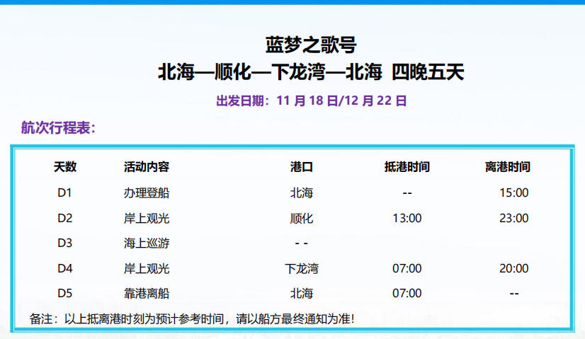 5、以上行程的靠岸及離岸時間均為參考時間,根據(jù)實際情況可能會有所改動,具體以通知書為準(zhǔn),請務(wù)必留意日報最晚回船時間,合理安排岸上游覽行程,以免錯過登船。