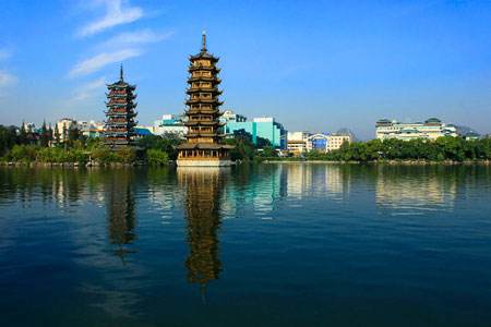 桂林日月塔又稱金塔銀塔、情侶塔;日塔別名叫金塔,月塔別名叫銀塔,所以也有金銀塔之稱。日月雙塔坐落在桂林市美麗的杉湖中,日塔為銅塔,位于湖中心,高41米,共9層,月塔為琉璃塔,高35米,共7層。兩塔之間以湖底一條10米長的湖底隧道相連。