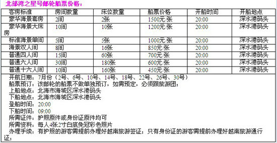 “北部灣之星”號豪華郵輪由廣西北部灣國際港務集團旗下北海郵輪碼頭公司購置,是首家國內注冊公司自有船舶投入中越跨國海上旅游航線的大型郵輪。該郵輪總噸位9960噸,高9層,全長135米,寬20.6米,核載客量399人。行程從始發(fā)港北海出發(fā)至終點越南下龍市全程約10小時。