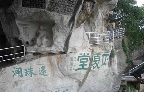 還珠洞位于伏波山的山腹,坐船或從陸地步行入洞。洞內(nèi)高4—6米,寬 6—8米,總長120余米,面積600余平方米。還珠洞內(nèi)的文物石刻很多,是伏波山的精華所在。還珠洞還是唐朝除西山的慶林寺外,又一個佛教圣地。信奉佛教的僧徒們,在洞內(nèi)雕塑了許多佛像。千佛巖中有許多尚未成形的粗鑿佛像,猶如風化剝蝕的斧鑿痕。